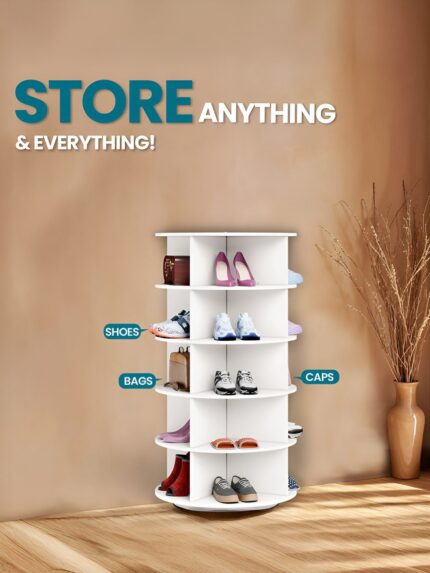 Set content: 5-Tier Shoe RackColor: WhiteMaterial: Engineered Wood Features: Moisture Resistant 360deg Rotating Durable Scratch Resistant